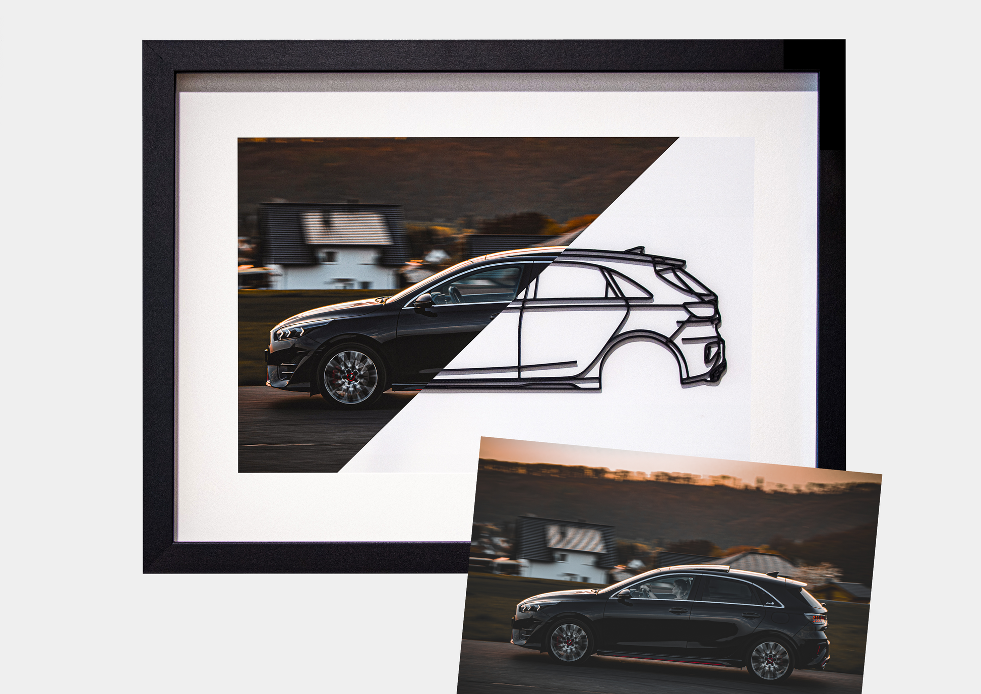 Wir verwandeln dein Foto in ein Kunstwerk. Selbst gezeichnet, ohne KI. Die 3D-gedruckte Silhouette wird in einem hochwertigen, modernen schwarzen Bilderrahmen präsentiert und ist ein absolutes Muss für jeden Car Guy und jedes Car Girl.