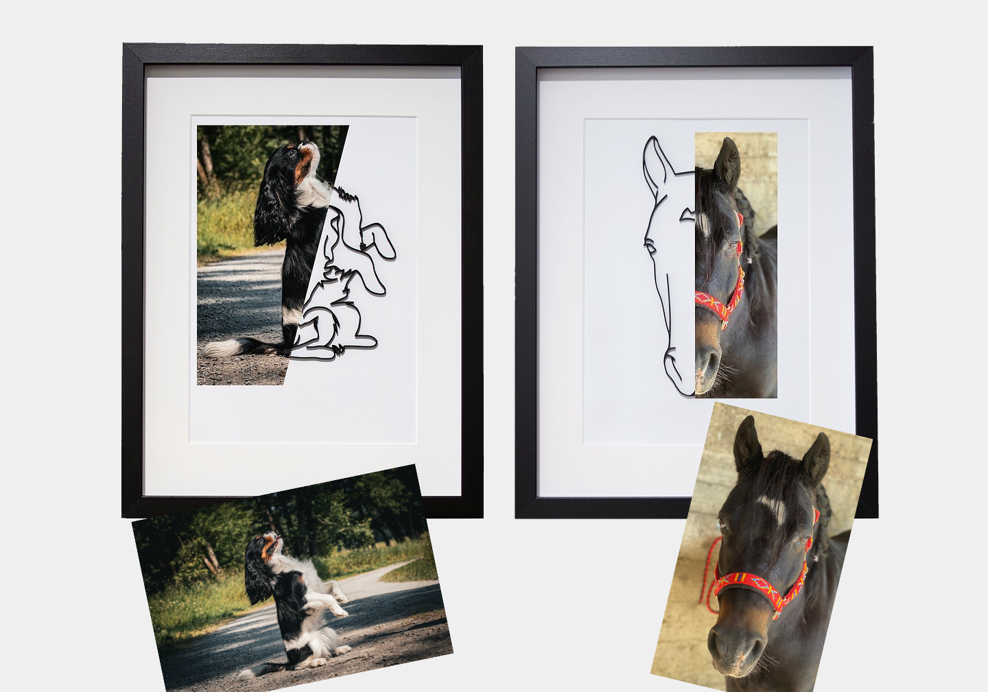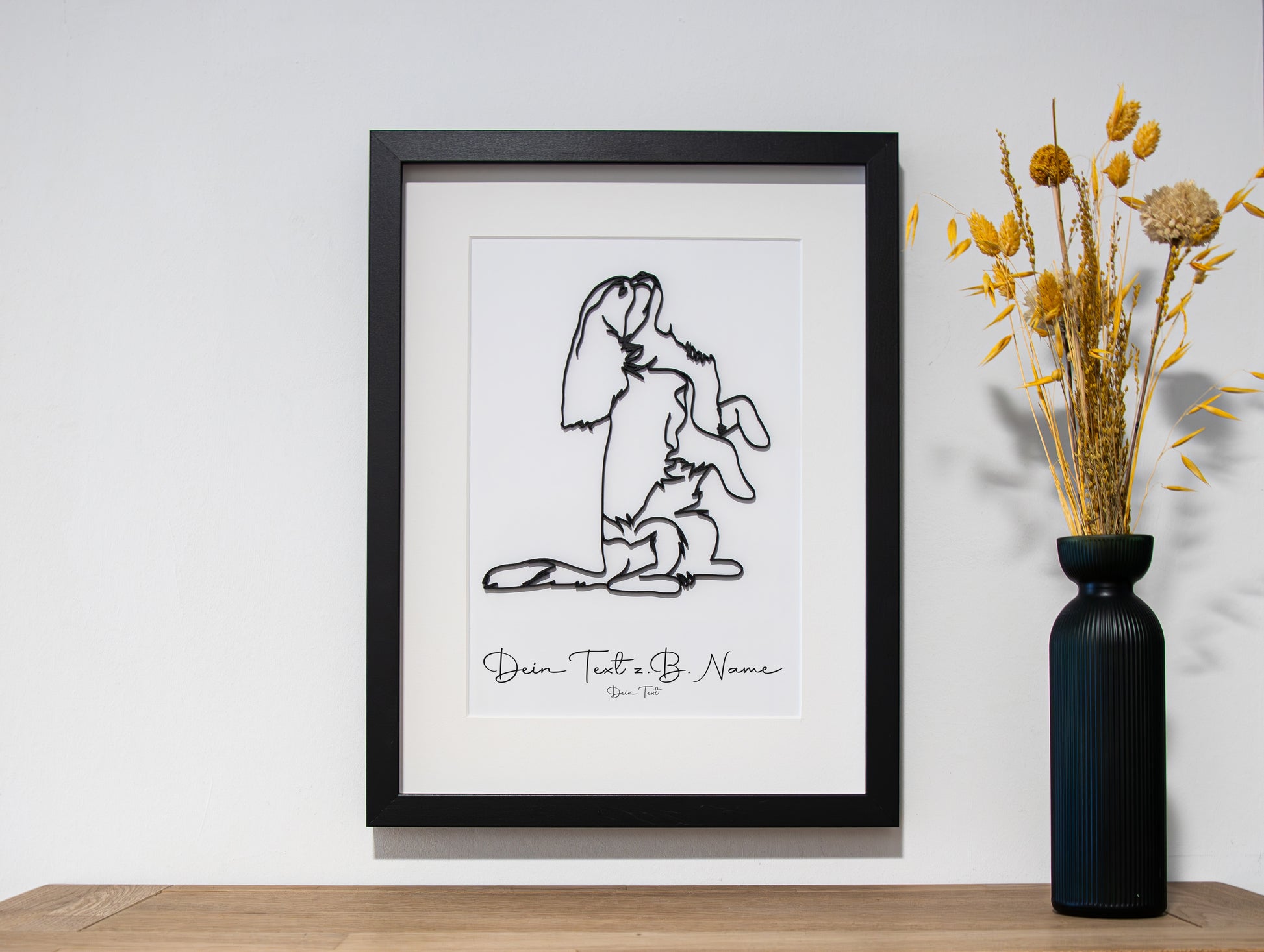 Wir verwandeln dein Foto in ein Kunstwerk. Selbst gezeichnet, ohne KI. Die 3D-gedruckte Silhouette wird in einem hochwertigen, modernen schwarzen Bilderrahmen präsentiert und ist ein absolutes Muss für jeden Tierliebhaber